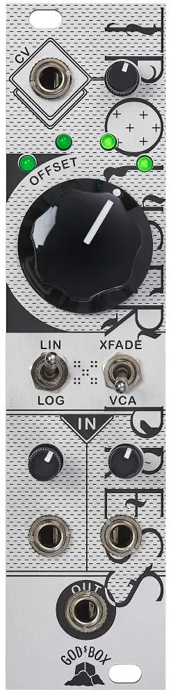 While in XFADE mode, the gain of the input channels is at maximum 0dB, the middle position the channels meet at -3dB for even fades. Changing the offset control pans between the left and right inputs. In VCA mode, the amplitude is no longer kept at 0dB and can reach +20dB, functioning as a normal VCA. The LIN / LOG switch controls the response of the amplifiers in both XFADE and VCA mode.